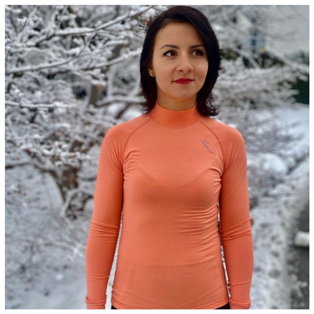 Dámské tričko v atraktivní meruňkové barvě je díky použitému materiálu velmi příjemné a krásně hřeje. Díky anatomickému střihu skvěle kopíruje křivky postavy. Je ideální jako první nebo druhá vrstva do chladného počasí.