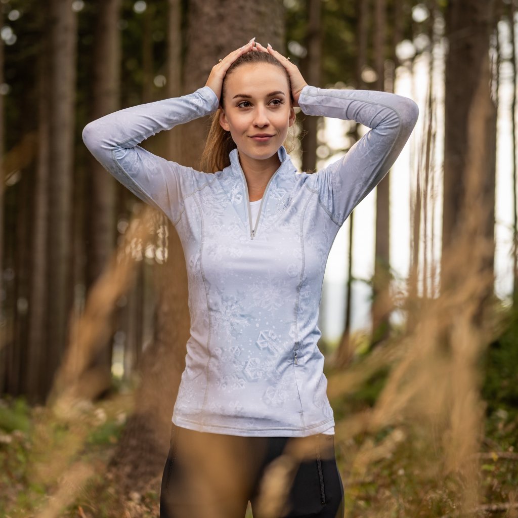 Dámský rolák v jemné bílo-šedé barvě, s decentním potiskem vloček. Rolák je díky elegantnímu provedení vhodný na běžné nošení nebo na sportovní aktivity.