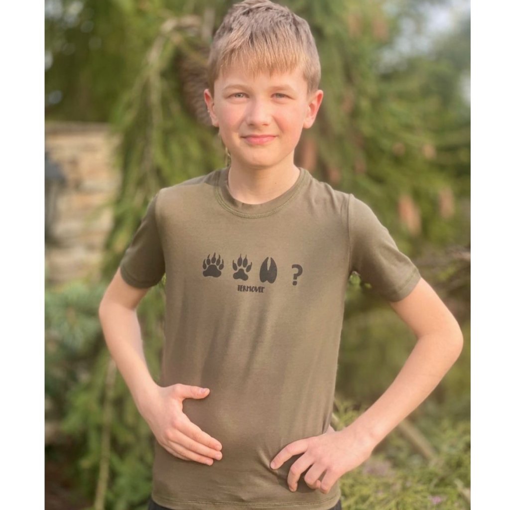 Bavlněné dětské tričko v khaki barvě s potiskem zvířecích stop. Stylový lovecký design. Vhodné na výlety, tábory a další volnočasové aktivity.