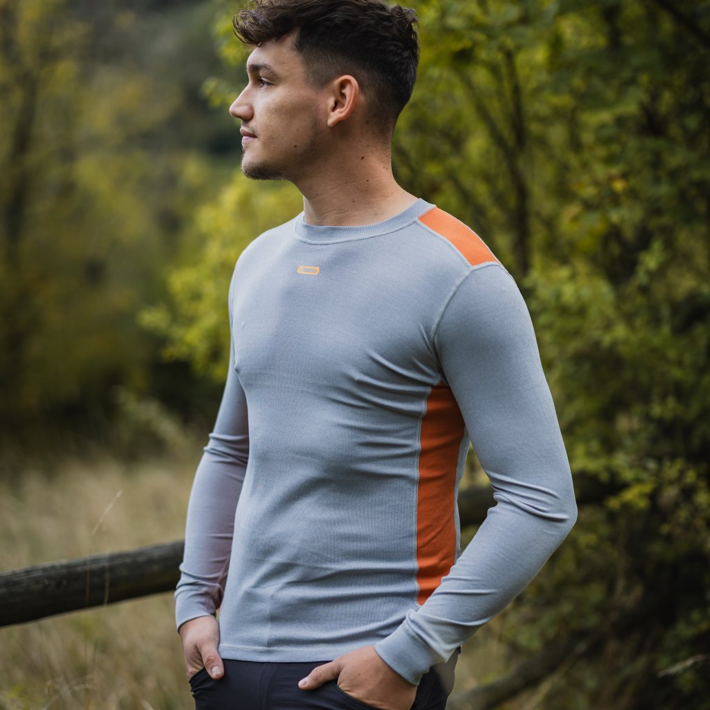 Šedé tričko s dlouhým rukávem a dynamickými oranžovými vklady na bocích a ramenou je navrženo speciálně jako základní první vrstva (termoprádlo) pro jakoukoli aktivitu. Oranžové detaily zároveň zvyšují vaši viditelnost a bezpečnost. Tričko je vyrobeno ze 100% mikropolypropylenu, který neabsorbuje vlhkost, ale okamžitě ji odvádí pryč od těla, čímž vás udrží v suchu a teple. Díky antibakteriálním vlastnostem zabraňuje zápachu i po celém dni aktivity. Materiál je lehký, prodyšný, nežehlivý a mimořádně odolný. Ideální pod jiné vrstvy oblečení pro sport, turistiku nebo práci venku.