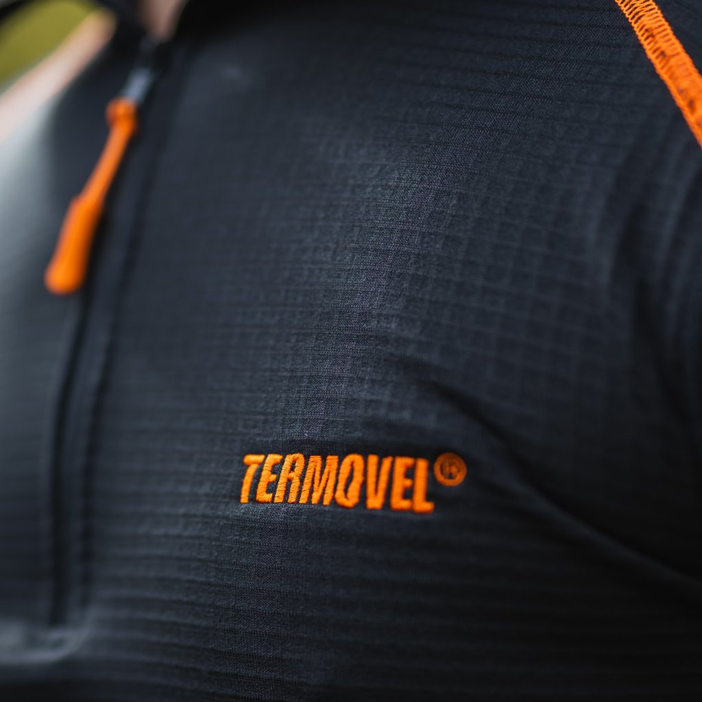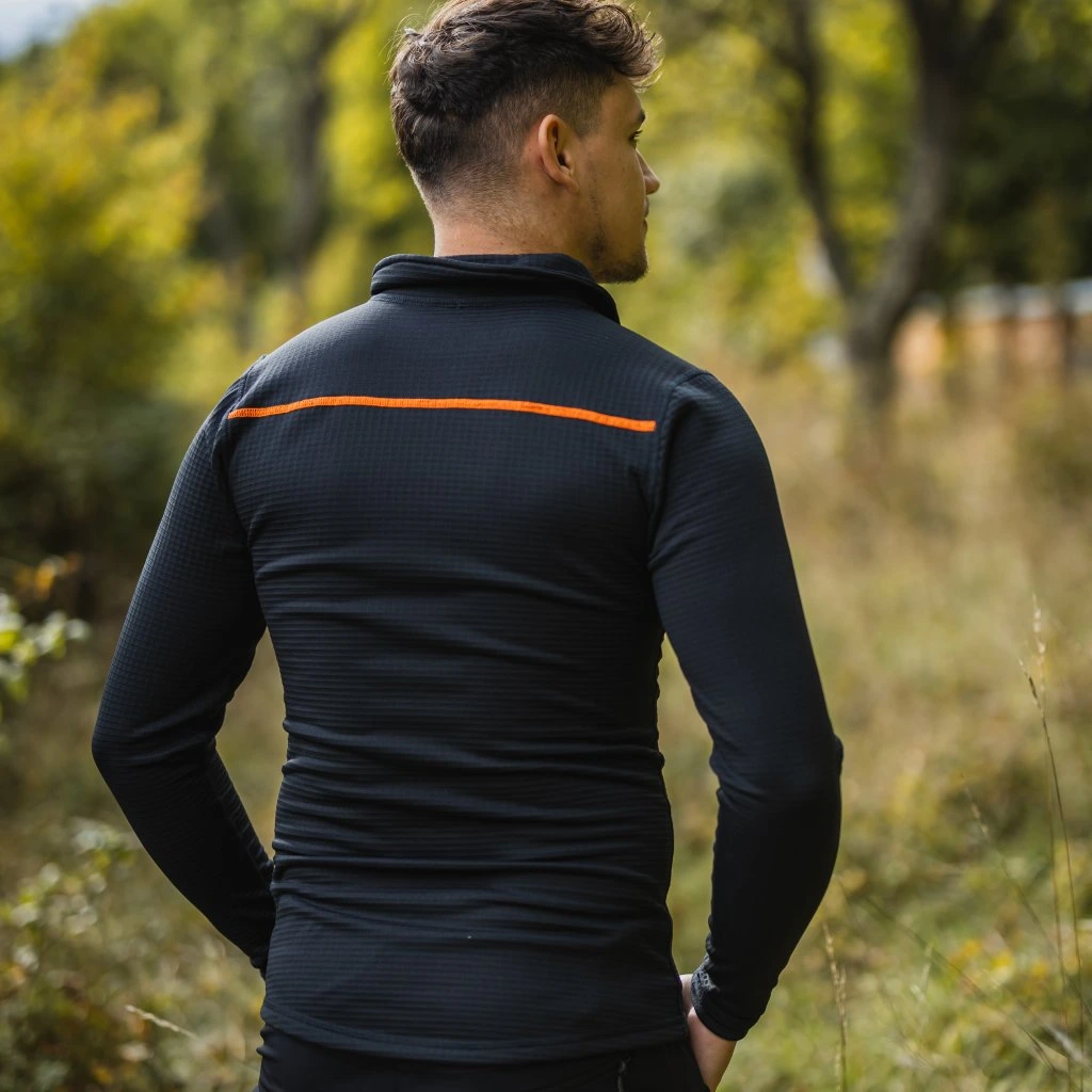 Černý rolák na zip je vyroben z materiálu s jemným kostkovým designem, který je z vnitřní strany jemně počesán. Tato úprava zajišťuje příjemný pocit na pokožce. Materiálové složení zaručuje pružnost a rychlé schnutí, přičemž si zachovává svůj tvar a barvu i po opakovaném praní. Oranžový štěp na zádech a ramenou dodává oděvu moderní vzhled. Praktický zip u krku umožňuje snadnou regulaci teploty a chrání krk před chladem. Tento všestranný rolák je vhodný do práce, na víkendové aktivity nebo na posezení s přáteli. Ideální jako samostatný kousek k džínům, nebo jako základní/střední vrstva pod bundu.
